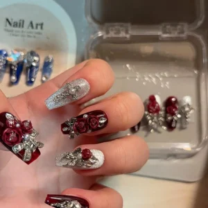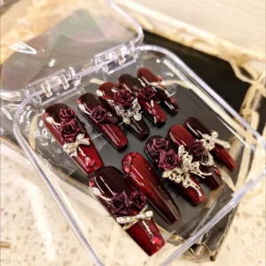 N063 Dark Punk Red Cat Eye 3D Rose Rhinestone Long Square Press-On Nails