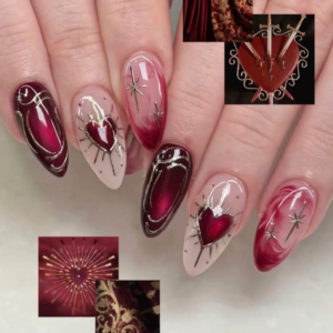 N072 Red Baroque Glossy Almond Hand-Painted Heart Press-On Nails