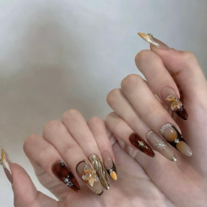 N068 Artistic Coffee Brown Glossy 3D Carved Long Oval Press-On Nails