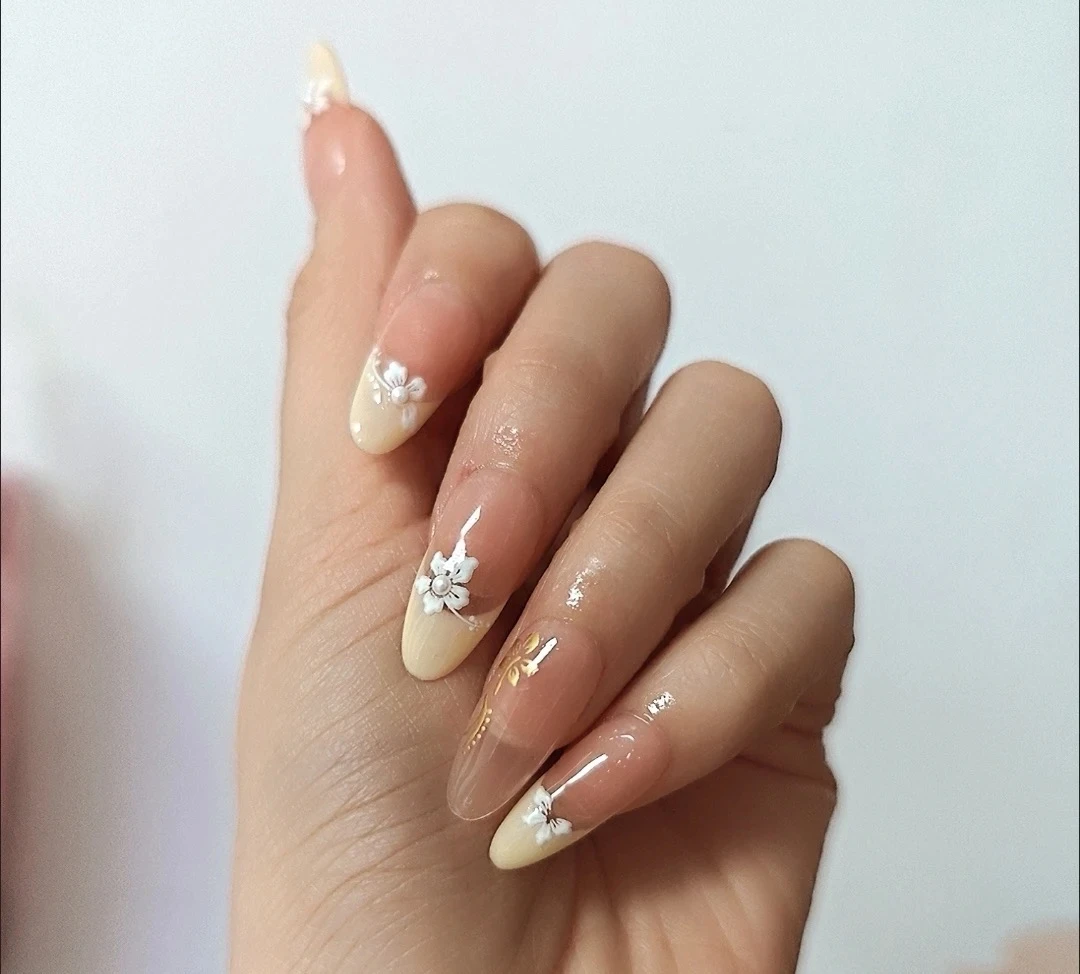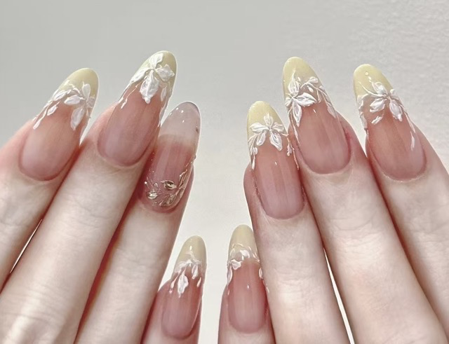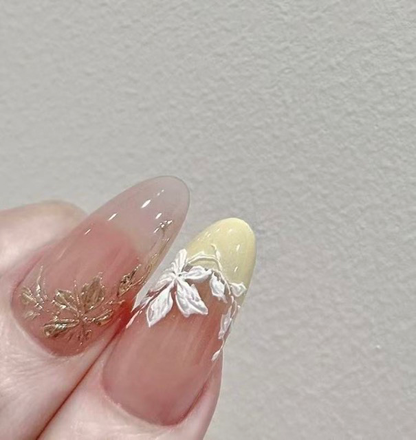 N017 Soft Yellow Creamy Medium Oval Hand-Painted Orchid Press-On Nails