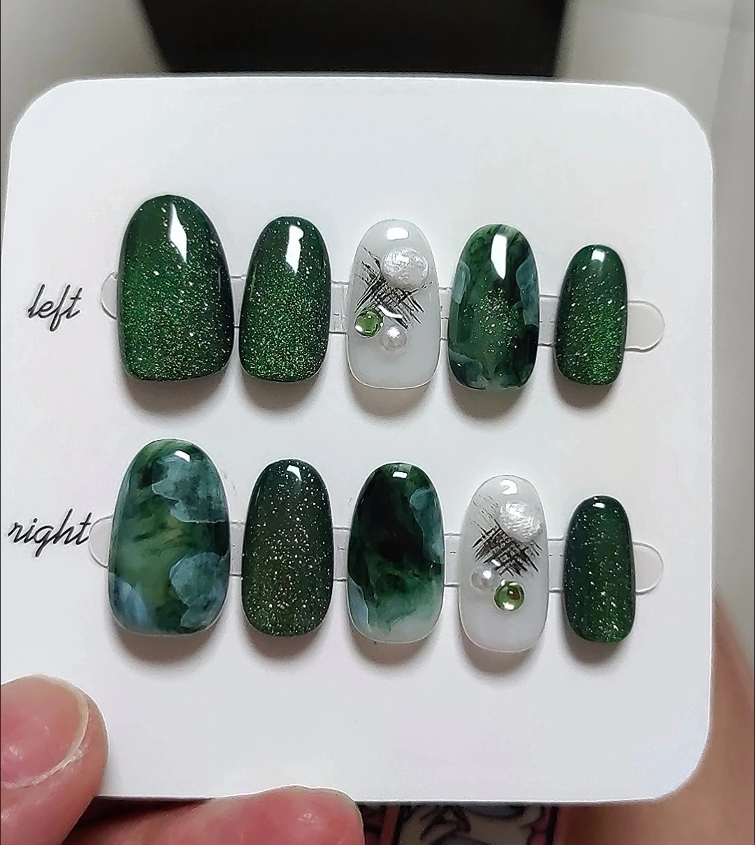 Be the first to review “N044 Dark Green Cat Eye Short Oval Hand-Painted Press-On Nails with Pearl Details”