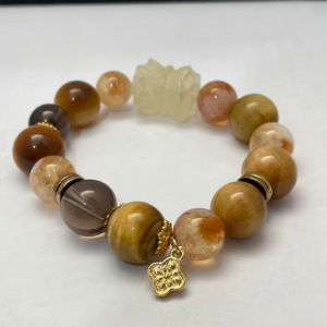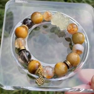 The Golden Legend bracelet embodies prosperity and mythical power via golden-hued crystals. Golden Tiger’s Eye energy fuels courage and decisiveness; yellow crystals attract fortune and luck; smoky crystal filters negativity. The lotus-shaped accessory symbolizes completeness and peace. It gifts wealth gathering, courage empowerment and mental-physical protection.
