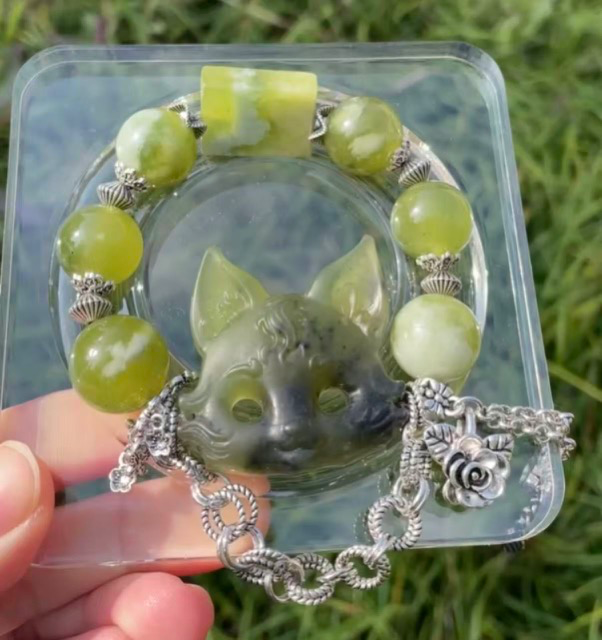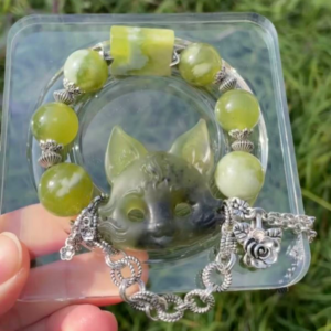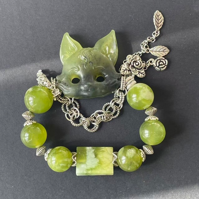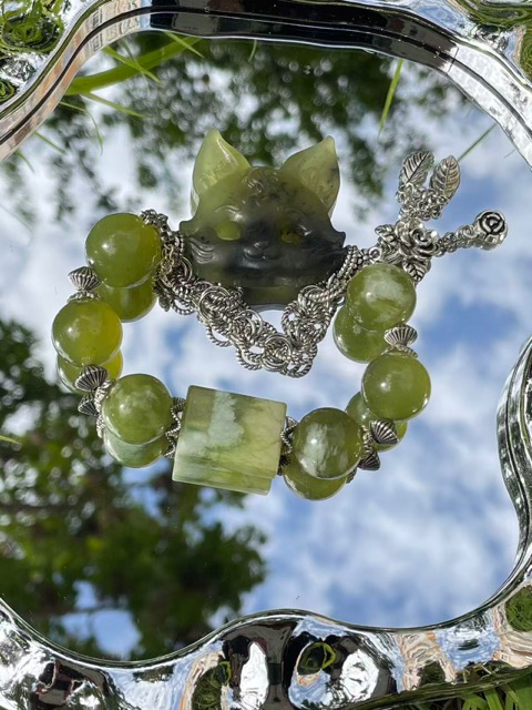 Named “The Wizard of Oz”, this bracelet is crafted from Serpentine jade, capturing the ethereal charm of an enchanted green forest. The translucent green jade beads paired with the jade fox mask create a mystical woodland vibe, while Serpentine jade’s gentle energy calms the soul, ignites intuition, and brings the wearer a sense of harmony with nature, as if wandering through a magical green haven.