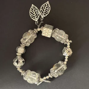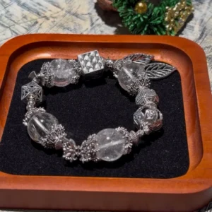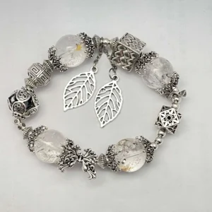 Named Snow Kiss, this bracelet is crafted with white quartz, capturing the crisp, pure essence of a snowflake’s gentle kiss. White quartz is known as the “master healer”—it amplifies positive energy, clears mental clutter and enhances spiritual clarity. The intricate silver leaf accents and textured metalwork mirror frost-kissed foliage, making the bracelet a wearable symbol of purity that brings mental focus, emotional calm and renewed vitality to the wearer.