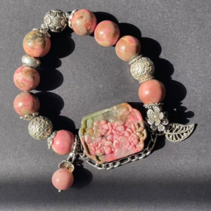 Named The Rose of Love, this bracelet is crafted with rhodonite, a stone tied to the heart chakra and the tender passion of rose blooms. Rhodonite soothes emotional wounds, fosters self-love and encourages compassionate connections. The intricate silver filigree and bold rhodonite centerpiece mirror a roses layered petals, turning the bracelet into a wearable symbol of love that brings emotional healing, heart-centered courage and harmonious relationships to the wearer.